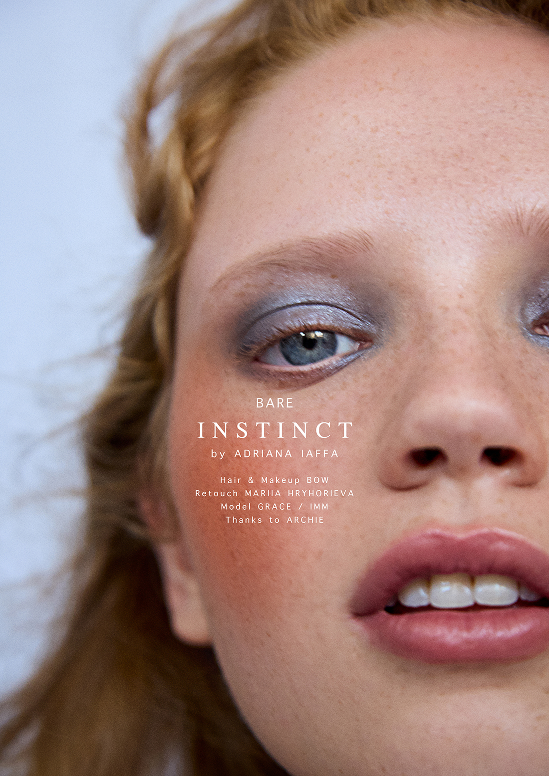 There’s a wild honesty in these colours: berry-stained lips, wind-kissed blush, and the luminous softness of skin left almost untouched. The makeup, by BOW, feels spontaneous — as if painted by the season itself. Petal pinks melt into russet tones, while cool silver shadows drift like early dusk across the eyes.