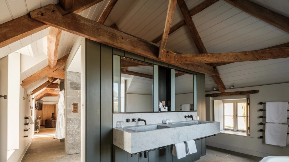 The rooms — around forty in total — are spread between the Georgian manor and beautifully converted farm buildings nearby. Interiors mix historic character with modern luxury: freestanding bathtubs, soft linen, antique furniture and quiet views across the Somerset countryside.