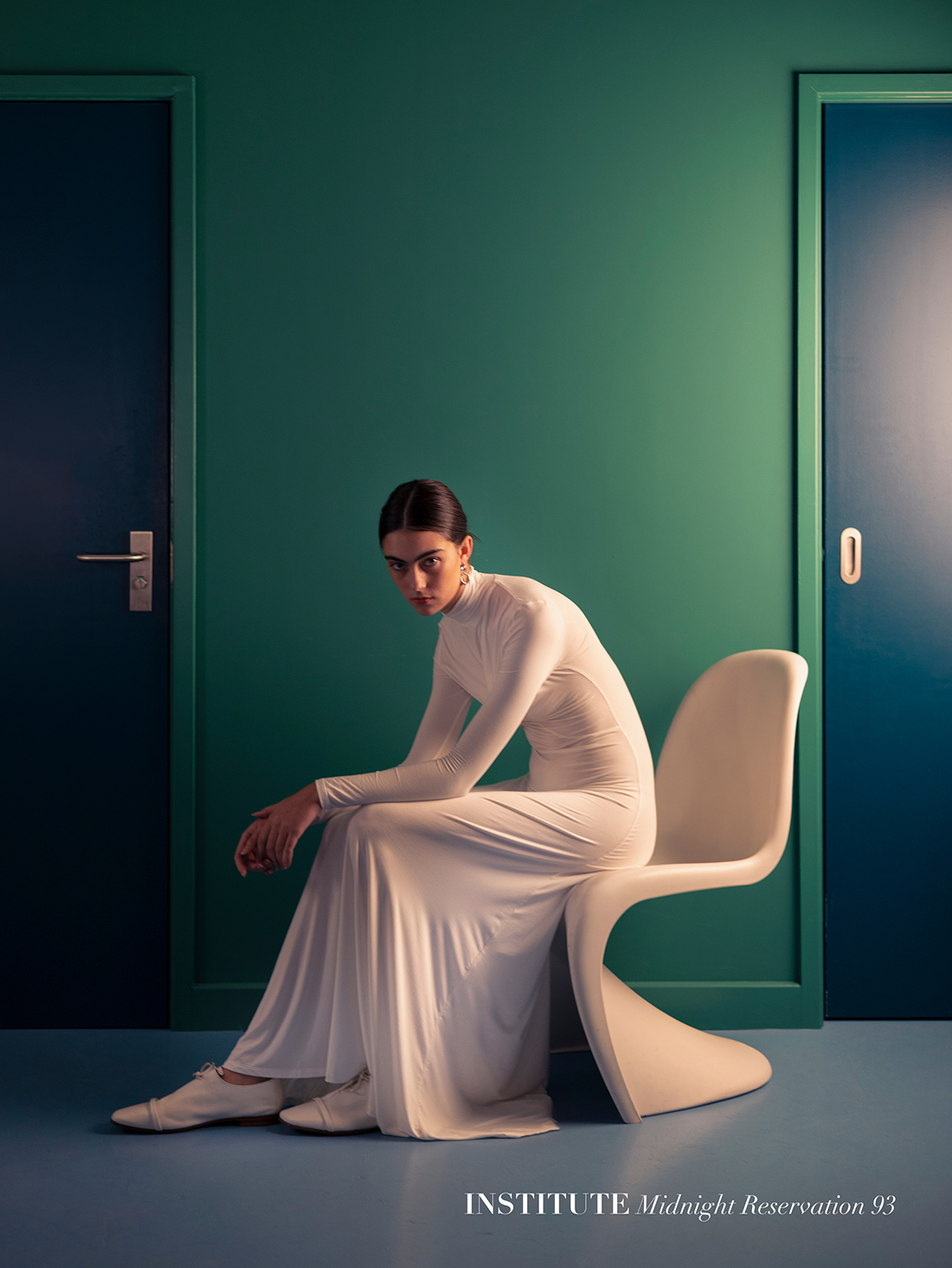 At the centre, Valeria Goettert embodies a poised duality, sharp yet soft, distant yet entirely present. Her movements feel deliberate, almost sculptural, shifting between reclined ease and upright precision. There is a tension in the stillness, a sense that each pose holds something just beneath the surface.
