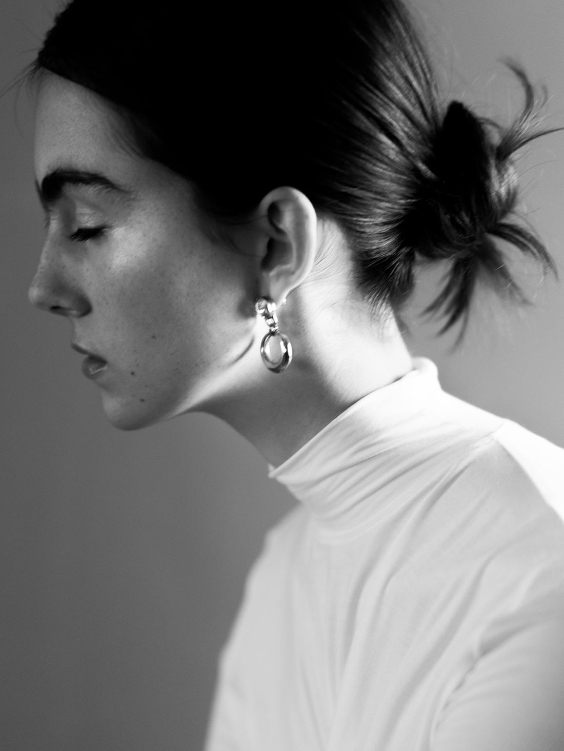 Hair by Mika Matsumoto is pulled back with precision, clean and minimal, revealing the architecture of the face and neck. The choice sharpens the entire narrative, stripping everything back to line and form. Makeup by Sheiba Yamashiro remains luminous and restrained, skin left to glow with subtle definition that enhances rather than transforms. The result is beauty that feels modern, effortless, and quietly exacting.