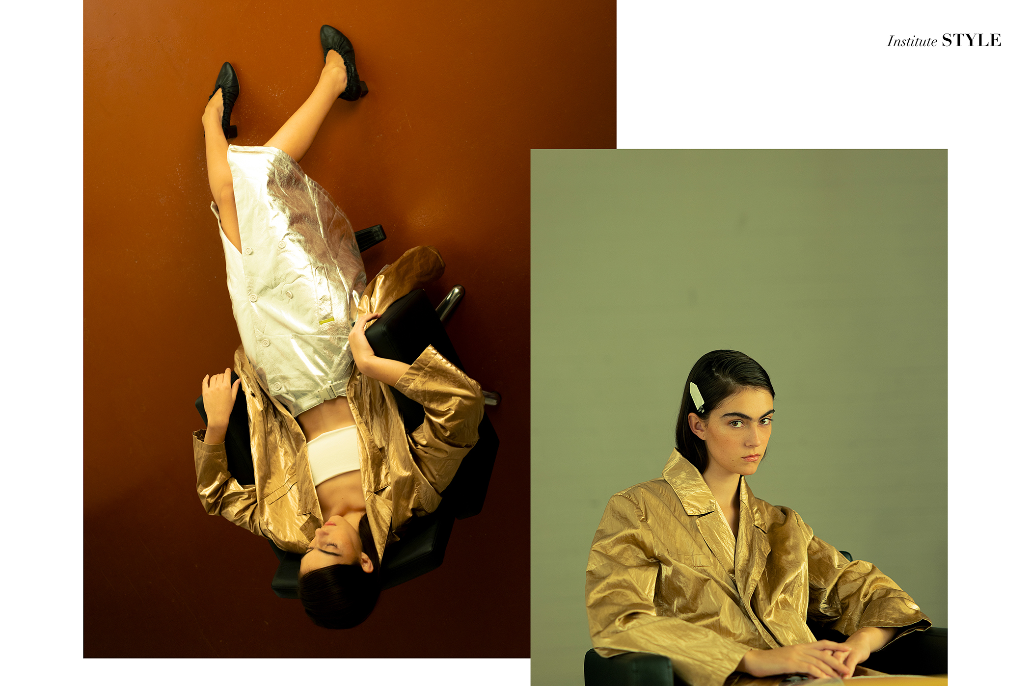 Styling by Sitty Vonne Lin leans into contrast, liquid metallics against structured tailoring, sheer silhouettes layered beneath high-gloss outerwear. A molten gold coat captures the light with quiet opulence, while a sleek black patent trench introduces a sharper edge, grounding the softness beneath. The clothes feel tactile and responsive, never static, always in dialogue with the space around them.